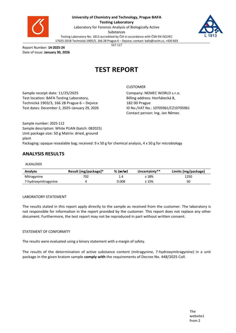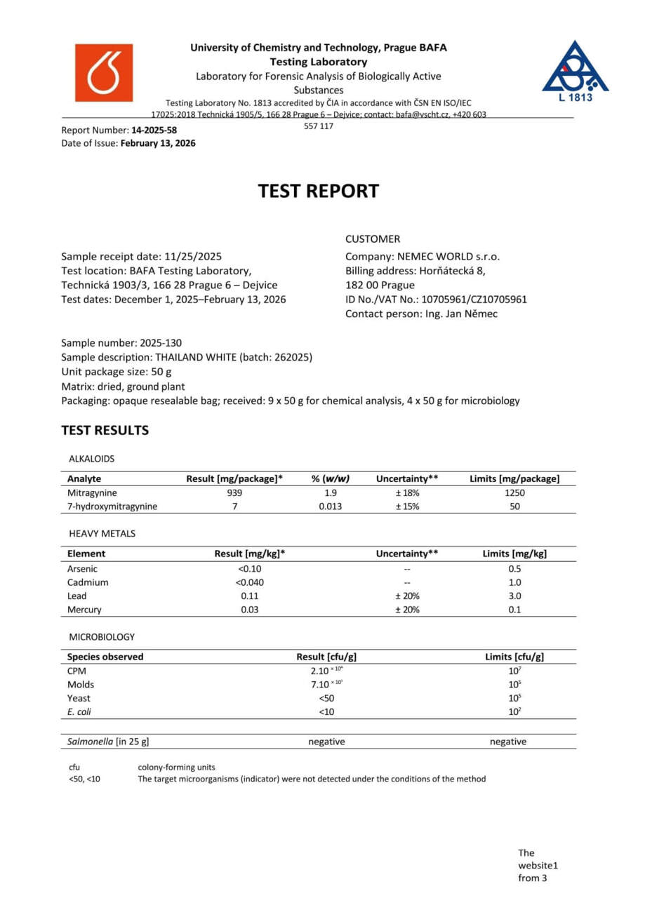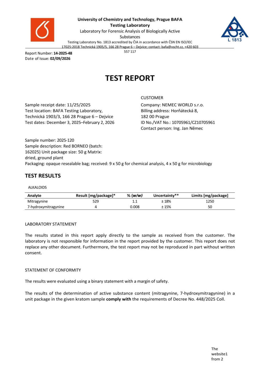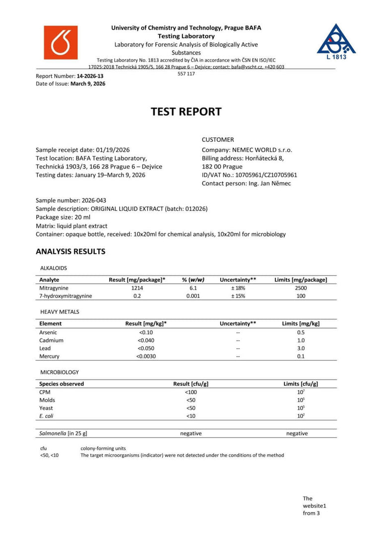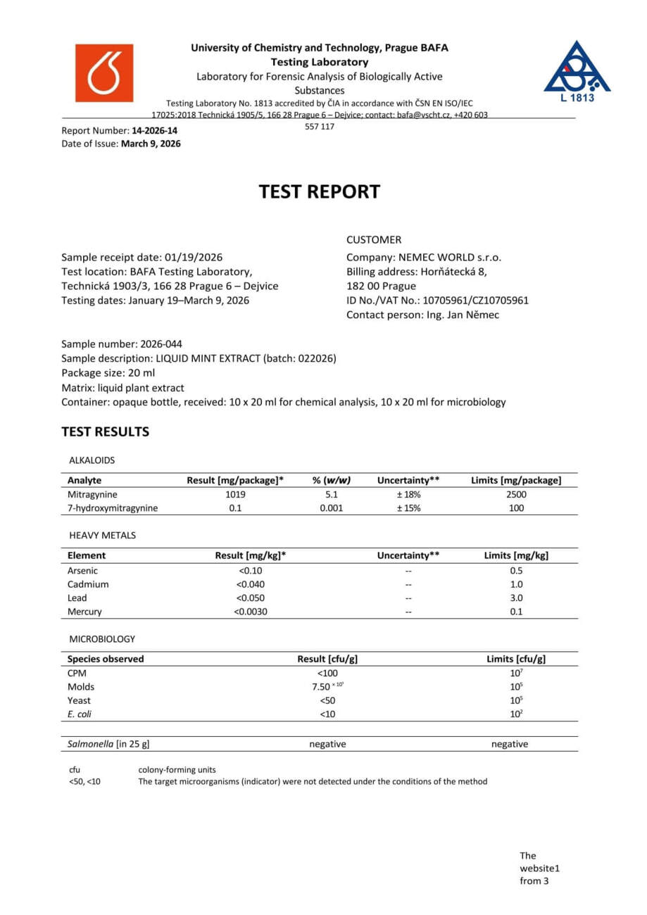 With us you can be sure that you are buying Kratom of the highest quality. As the only company on the European market, we carefully test each batch at VŠCHT in Prague, where we determine the exact percentage of alkaloids and the presence of living or non-living fungi.