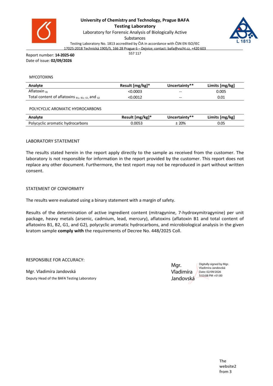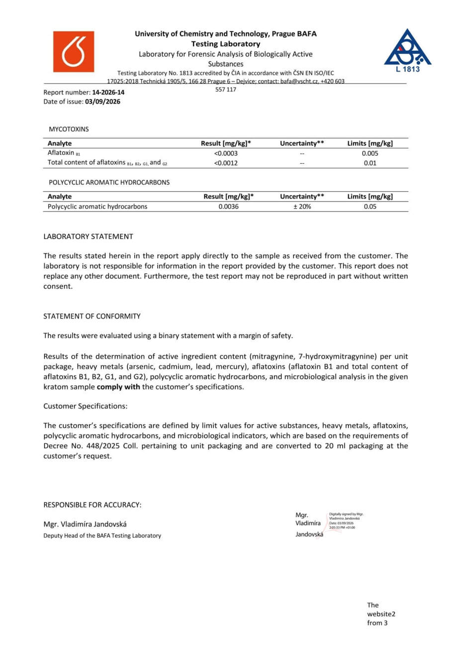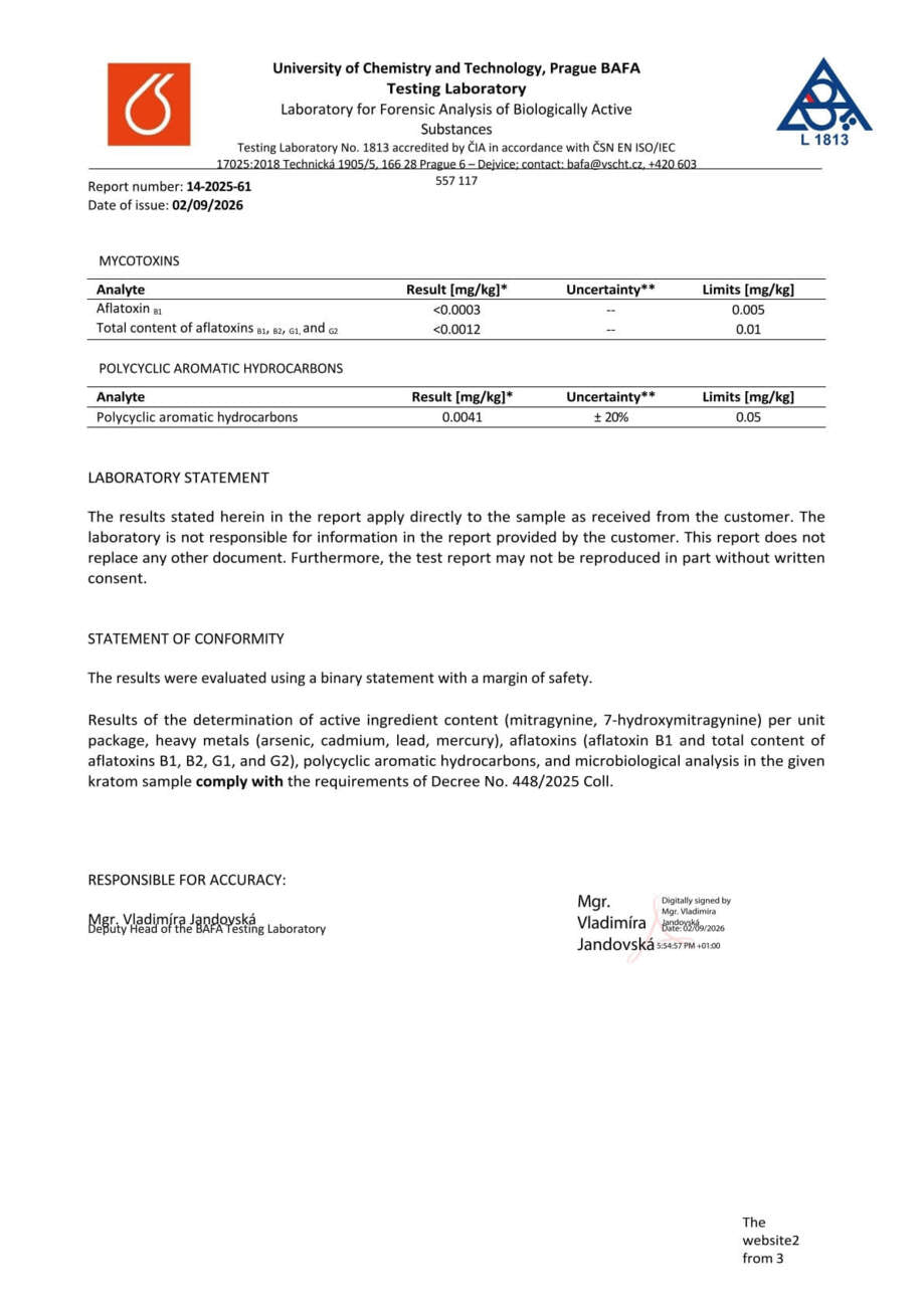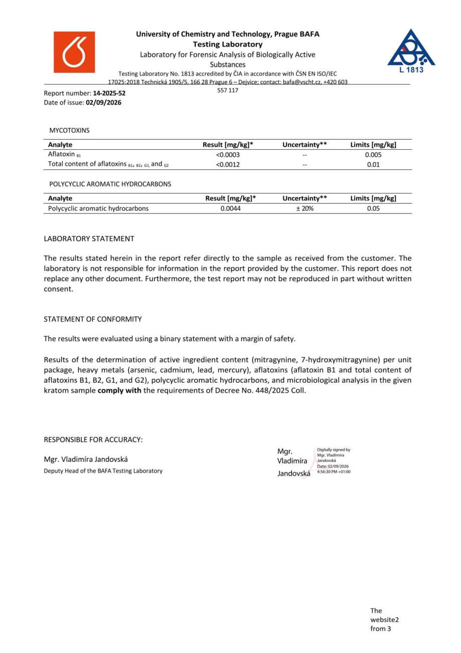 Con nosotros, tiene la seguridad de que está comprando kratom de alta calidad. Cada lote se somete a rigurosas pruebas en la Universidad de Química y Tecnología de Praga, donde se verifica el porcentaje exacto de alcaloides, la presencia de mohos vivos y no vivos, y el contenido de metales pesados. Gracias a ello, se garantiza la pureza, la seguridad y una calidad constante en cada envase.