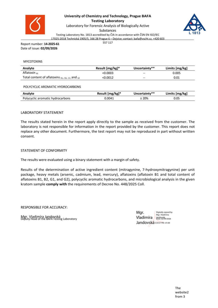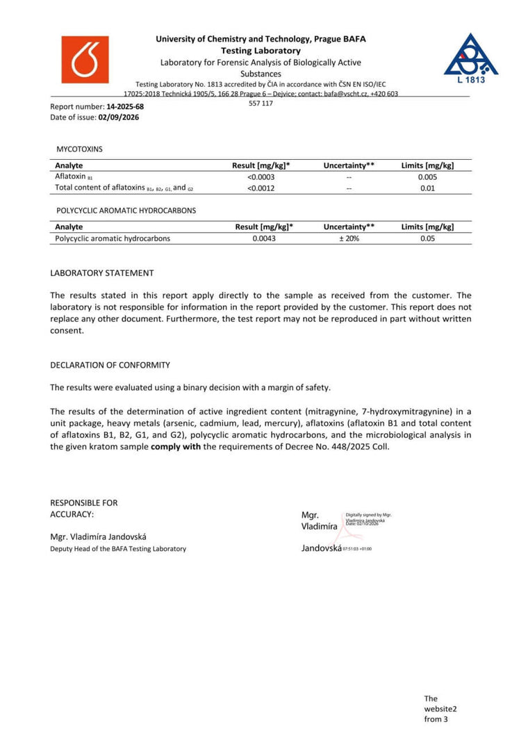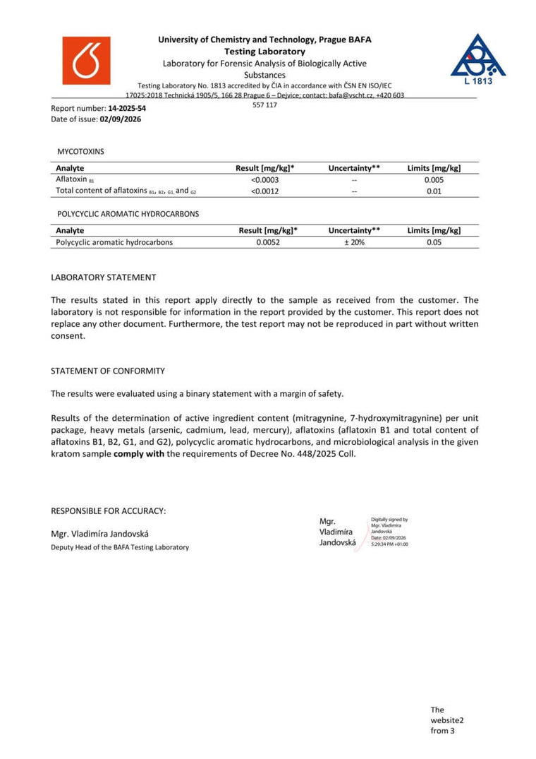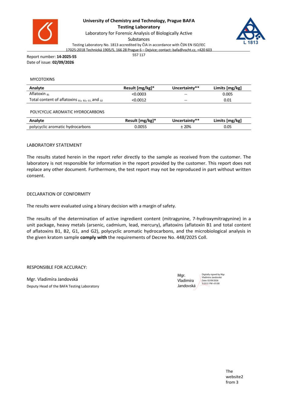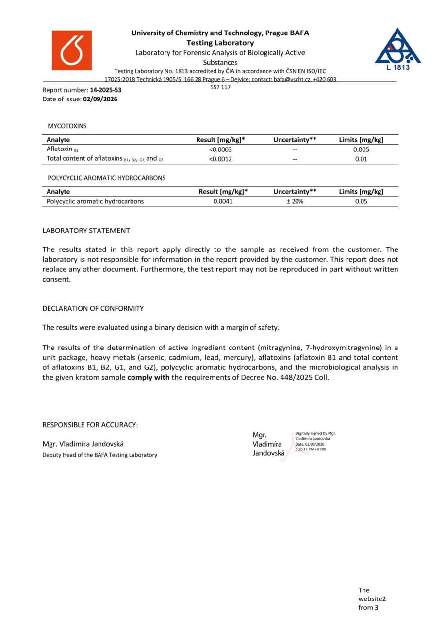 Con nosotros, tiene la seguridad de que está comprando kratom de alta calidad. Cada lote se somete a rigurosas pruebas en la Universidad de Química y Tecnología de Praga, donde se verifica el porcentaje exacto de alcaloides, la presencia de mohos vivos y no vivos, y el contenido de metales pesados. Gracias a ello, se garantiza la pureza, la seguridad y una calidad constante en cada envase.